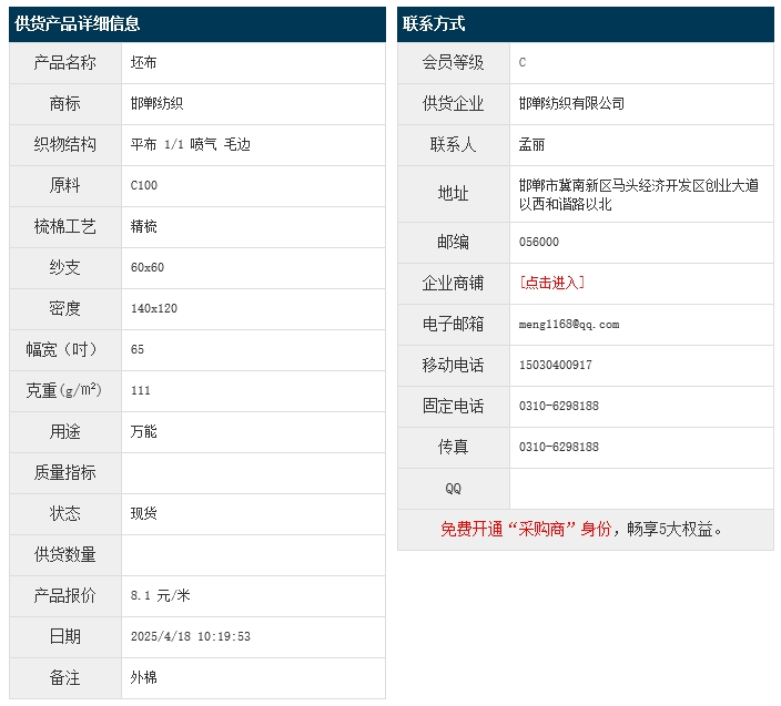 4月18日,邯鄲紡織有限公司外棉純棉平布JC100 60x60 140x120 65" 1/1 111g/㎡ 噴氣 毛邊,報價為8.1元/米,實際成交價以協(xié)商為準。[點擊查看詳情]