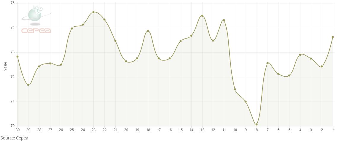 4月17日(周四),巴西CEPEA/ESALQ棉花價(jià)格指數(shù)報(bào)73.63美分/磅,較前一交易日上漲1.66%,該指數(shù)較前月同期下跌0.07%。