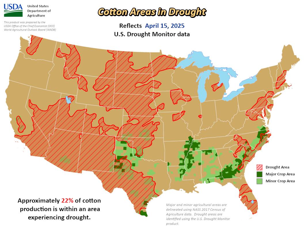 美國農(nóng)業(yè)部(USDA)下屬的首席經(jīng)濟學(xué)家辦公室(OCE)當(dāng)?shù)貢r間周四根據(jù)當(dāng)日發(fā)布的美國旱情監(jiān)測圖整理的美國農(nóng)業(yè)旱情文件顯示,截至4月15日當(dāng)周,約22%美棉產(chǎn)區(qū)受到干旱影響,前周為21%。