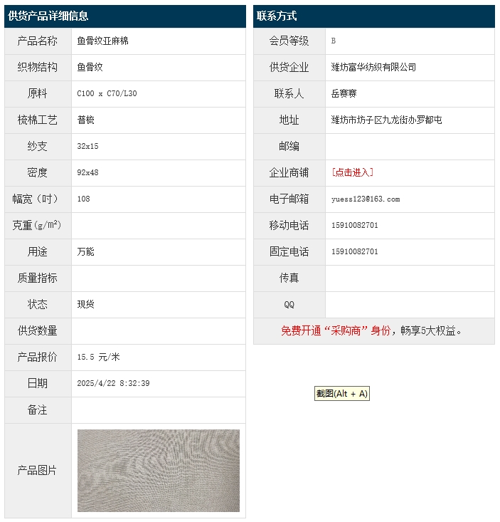 4月22日,濰坊富華紡織有限公司魚(yú)骨紋亞麻棉布C100xC70/L30 32x15 92x48 108",報(bào)價(jià)為15.5元/米,實(shí)際成交價(jià)以協(xié)商為準(zhǔn)。[點(diǎn)擊查看詳情]