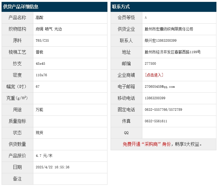 4月22日,滕州宏鷹紡織有限責(zé)任公司高配滌棉府綢T65/C35 45x45 110x76 67" 噴氣 光邊,報價為4.7元/米,實際成交價以協(xié)商為準(zhǔn)。[點擊查看詳情]