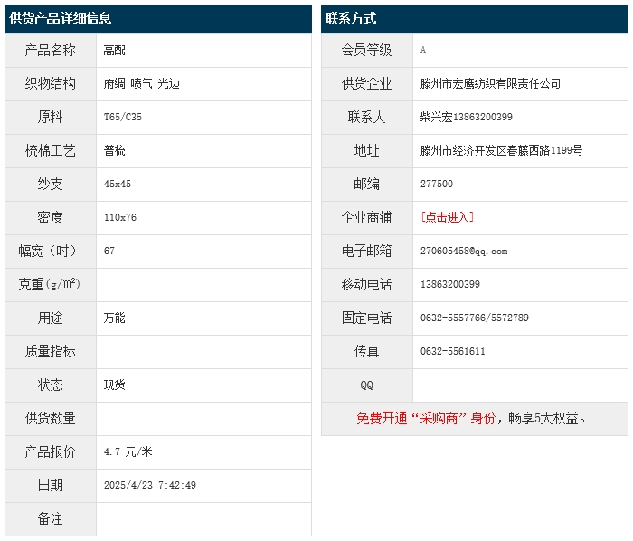 4月23日,滕州宏鷹紡織有限責(zé)任公司高配滌棉府綢T65/C35 45x45 110x76 67" 噴氣 光邊,報(bào)價(jià)為4.7元/米,實(shí)際成交價(jià)以協(xié)商為準(zhǔn)。[點(diǎn)擊查看詳情]