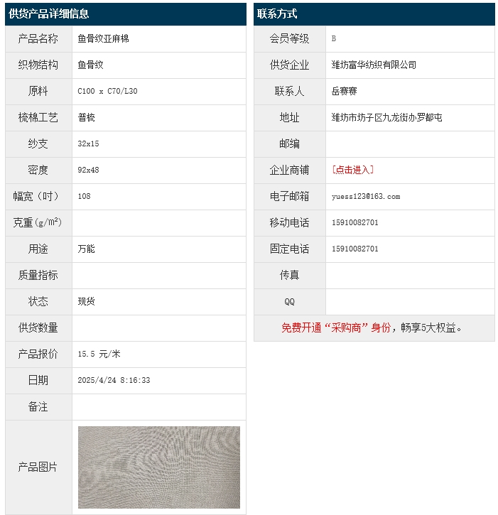4月24日,濰坊富華紡織有限公司魚骨紋亞麻棉布C100xC70/L30 32x15 92x48 108",報(bào)價(jià)為15.5元/米,實(shí)際成交價(jià)以協(xié)商為準(zhǔn)。[點(diǎn)擊查看詳情]