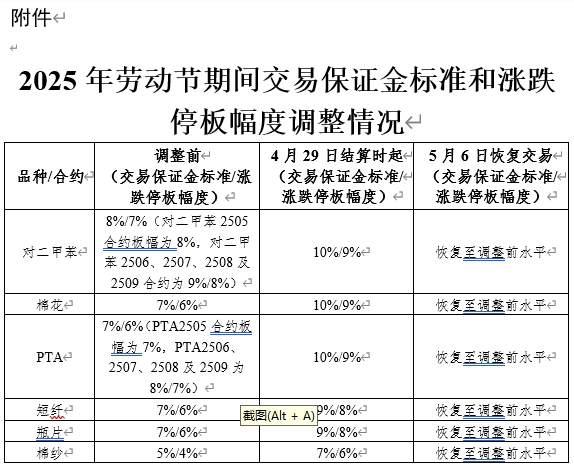 附件:2025年勞動節(jié)期間交易保證金標(biāo)準(zhǔn)和漲跌停板幅度調(diào)整情況