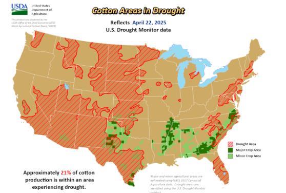 美國農(nóng)業(yè)部(USDA)下屬的首席經(jīng)濟(jì)學(xué)家辦公室(OCE)當(dāng)?shù)貢r間周四根據(jù)當(dāng)日發(fā)布的美國旱情監(jiān)測圖整理的美國農(nóng)業(yè)旱情文件顯示,截至4月22日當(dāng)周,約21%美棉產(chǎn)區(qū)受到干旱影響,前周為22%。