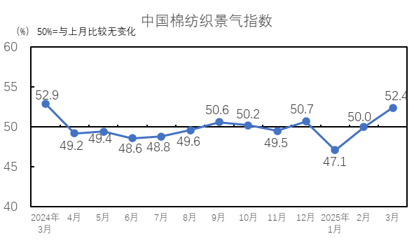 說明:中國棉紡織行業(yè)景氣指數(shù)采集自全國近500家次棉紡織廠,參考國家制造業(yè)PMI等指數(shù)制定方式,通過對多個主要指標加權計算得出,當指數(shù)高于50,表示棉紡織行業(yè)本月景氣程度好于上月,低于50則表示本月景氣程度不及上月。