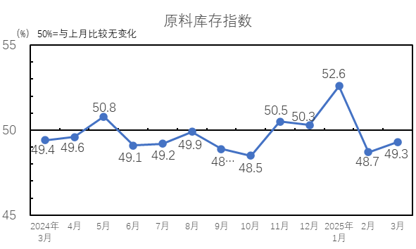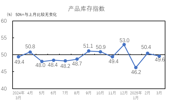 2025年3月,產品庫存指數(shù)為49.6%,低于臨界點,較2月下降0.8個百分點,產品的庫存量上升。3月上中旬市場表現(xiàn)尚可,但下旬受特朗普關稅政策逐步落地影響,下游需求減少,訂單下滑明顯,產品庫存量上升。紗庫存量指數(shù)為49.7%,較2月下降1.5個百分點;布庫存量指數(shù)為49.4%,較2月上升0.3個百分點。紗庫存量指數(shù)和布庫存量指數(shù)均低于臨界點。
