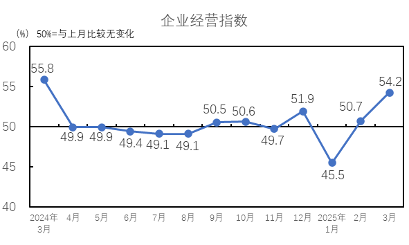 2025年3月,企業(yè)經(jīng)營指數(shù)為54.2%,高于臨界點,較2月上升3.5個百分點。2月正值春節(jié)假期,3月企業(yè)生產經(jīng)營恢復正常,營業(yè)收入和利潤總額情況較2月上升,但3月整體行情不及傳統(tǒng)旺季預期,利潤總額好轉低于營業(yè)收入好轉。從構成企業(yè)經(jīng)營指數(shù)的分項指標看,營業(yè)收入指數(shù)為56.3%,高臨界點,較2月上升5.6個百分點;利潤總額指數(shù)為52.0%,高于臨界點,較2月上升1.3個百分點。