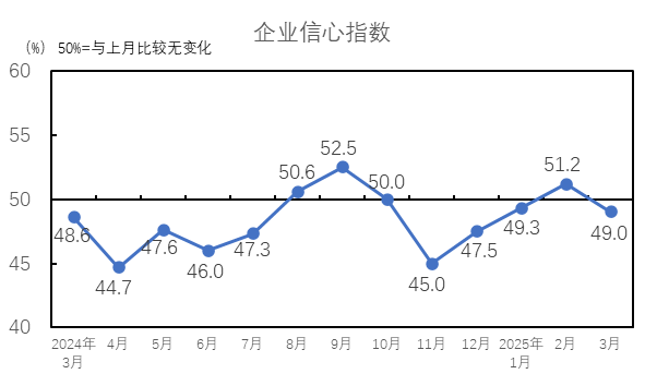 2025年3月,企業(yè)信心指數(shù)為49.0%,較2月下降2.2個百分點,企業(yè)信心指數(shù)低于臨界點,對未來市場的信心下降。3月傳統(tǒng)旺季行情不及預期,疊加3月下旬特朗普關稅消息影響,下游需求下降,企業(yè)訂單量明顯減少,企業(yè)對未來市場的信心下降。