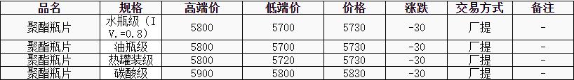 華東聚酯瓶片價(jià)格下跌30元至5730元/噸,原油下跌,成本支撐減弱。聚酯瓶片工廠報(bào)價(jià)多下調(diào)50元/噸,市場(chǎng)重心隨之下滑。5月貨源報(bào)盤(pán)5700-5750元/噸,局部略高5800元/噸;遞盤(pán)5650-5680元/噸。