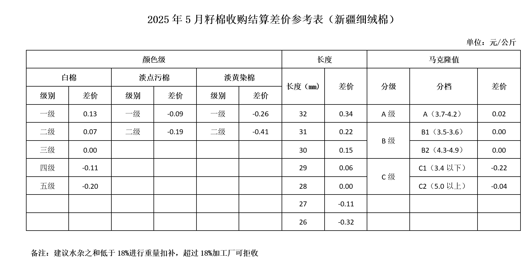 依據(jù)中國棉花協(xié)會發(fā)布的2025年4月《鋸齒加工細絨棉質(zhì)量差價表》和2024年9月-2025年2月新疆籽棉平均衣分率,折算得出籽棉收購差價,與上月相比,做如下調(diào)整: