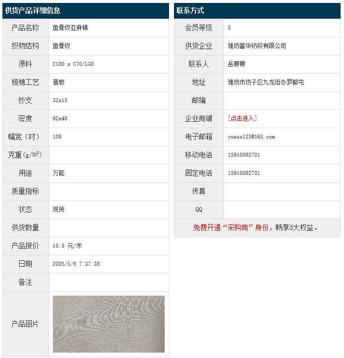 5月6日,濰坊富華紡織有限公司魚骨紋亞麻棉布C100xC70/L30 32x15 92x48 108",報價為15.5元/米,實際成交價以協(xié)商為準。[點擊查看詳情]