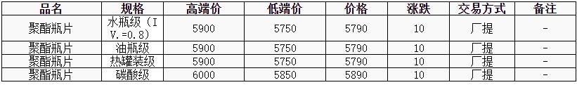 華東聚酯瓶片價(jià)格上漲10至5790元/噸,主原料提振,聚酯瓶片市場(chǎng)重心略有上揚(yáng)。5月貨源報(bào)盤5760-5900元/噸或期貨合約2507升水40元/噸,下游零星遞盤5750元/噸或2507升水20元/噸,買氣清淡。