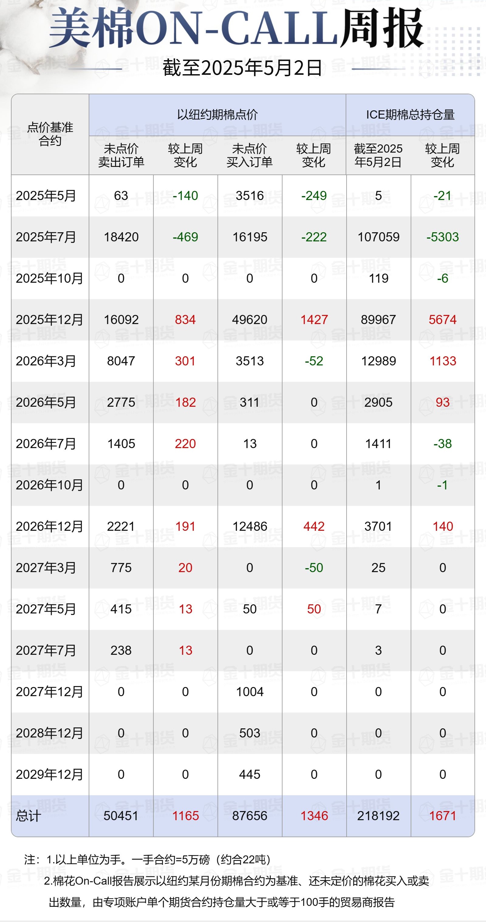 據(jù)美國商品期貨交易委員會(CFTC)最新數(shù)據(jù),截至5月2日,①美棉On-Call未點價賣出訂單50451手,環(huán)比增加1165手;未點價買入訂單87656手,環(huán)比增加1346手;②ICE期棉2505合約上賣方未點價合約為63手,環(huán)比減少140手;③ICE期棉2507合約上賣方未點價合約為18420手,環(huán)比減少469手;④ICE棉花期貨盤面2024/25年度(8月至次年7月)的On-Call合約未點價賣出訂單為18483手,環(huán)比減少609手。