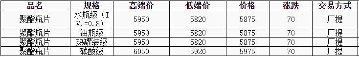 華東聚酯瓶片價格上漲70元至5875元/噸,原油上漲,疊加中美經(jīng)貿(mào)會談達成實質(zhì)性進展,聚酯瓶片市場重心明顯上揚。5-6月貨源報盤5820-5950元/噸,遞盤5800-5875元/噸,下游買氣偏弱,交投清淡。等待細節(jié)公布。