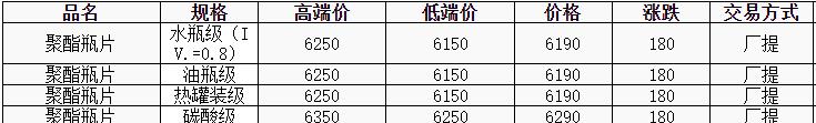 華東聚酯瓶片價(jià)格上漲180至6190元/噸,原油繼續(xù)上揚(yáng),加之苯乙烯裝置問題,提振芳烴產(chǎn)業(yè)鏈?zhǔn)袌鰞r(jià)格大幅上揚(yáng)。聚酯瓶片工廠價(jià)格多上調(diào)100-200元/噸,市場重心隨之上揚(yáng)。5-6月貨源報(bào)盤6150-6250元/噸,遞盤零星,業(yè)內(nèi)觀望情緒濃厚。