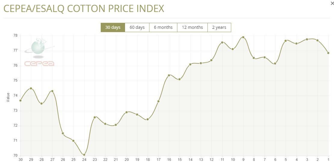 5月14日(周三),巴西CEPEA/ESALQ棉花價格指數(shù)報76.85美分/磅,較前一交易日下滑1.08%,較上月同期下滑0.34%。