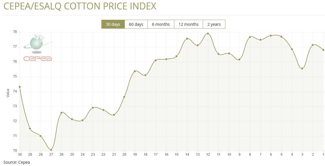 5月19日(周一),巴西CEPEA/ESALQ棉花價格指數(shù)報76.80美分/磅,較前一交易日下跌0.43%,較上月同期下跌0.40%。