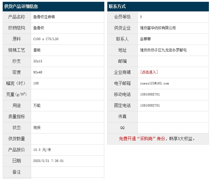 5月21日,濰坊富華紡織有限公司魚骨紋亞麻棉布C100xC70/L30 32x15 92x48 108",報(bào)價(jià)為15.5元/米,實(shí)際成交價(jià)以協(xié)商為準(zhǔn)。[點(diǎn)擊查看詳情]
