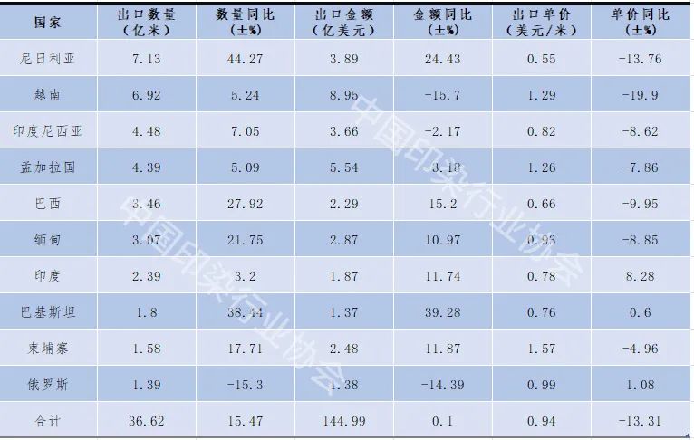 我國(guó)印染行業(yè)對(duì)主要市場(chǎng)的出口呈量增價(jià)跌態(tài)勢(shì)。1季度我國(guó)印染八大類(lèi)產(chǎn)品對(duì)東盟和RCEP貿(mào)易國(guó)出口數(shù)量分別增長(zhǎng)8.59%和8.45%,出口平均單價(jià)分別下滑13.65%和13.14%,降幅均高于行業(yè)出口平均水平。出口數(shù)量排名前十的國(guó)家中,僅對(duì)俄羅斯出口數(shù)量出現(xiàn)下滑,對(duì)其余國(guó)家出口數(shù)量均實(shí)現(xiàn)不同程度增長(zhǎng),其中對(duì)尼日利亞出口數(shù)量同比增幅達(dá)到44.27%,主要得益于當(dāng)?shù)卣掷m(xù)推進(jìn)的一系列改革措施,包括彌補(bǔ)收入流失、強(qiáng)化機(jī)構(gòu)間合作及推動(dòng)貿(mào)易主體自愿遵守法規(guī)等;對(duì)巴西、緬甸、巴基斯坦出口數(shù)量增速均超過(guò)20%。從出口平均單價(jià)看,對(duì)前十國(guó)家出口單價(jià)平均下降13.31%,其中對(duì)越南出口單價(jià)下降最明顯,降幅接近20%,對(duì)印度、巴基斯坦、俄羅斯出口單價(jià)有所增長(zhǎng)。