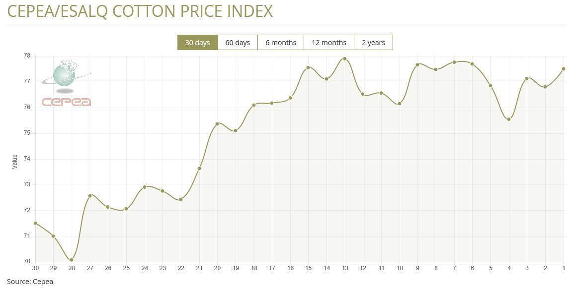 5月20日(周二),巴西CEPEA/ESALQ棉花價格指數(shù)報77.50美分/磅,較前一交易日上漲0.91%,較上月同期上漲0.51%。