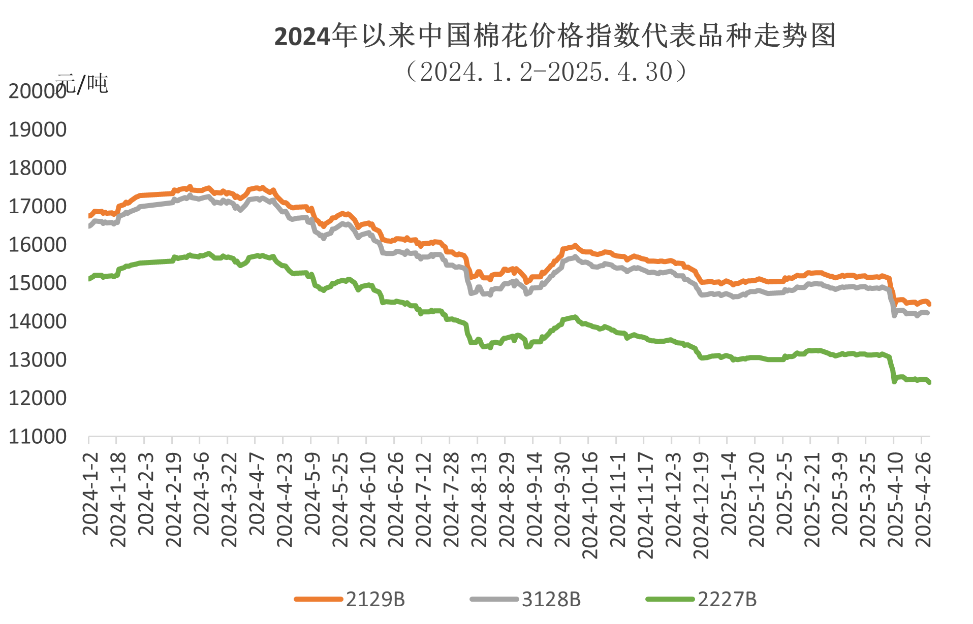 4月上旬,在中美持續(xù)互加關稅的影響下,中國棉花價格指數(shù)(CCIndex3128B)下跌至4年以來的低點14144元/噸,隨后有關部門釋放穩(wěn)經(jīng)濟穩(wěn)市場等積極信號,同時美國調(diào)整關稅政策預期增強,宏觀風險有所減弱,中國棉花價格指數(shù)維持震蕩。4月中國棉花價格指數(shù)(CCIndex3128B)月均價14367元/噸,環(huán)比下跌518元,同比下跌2640元。