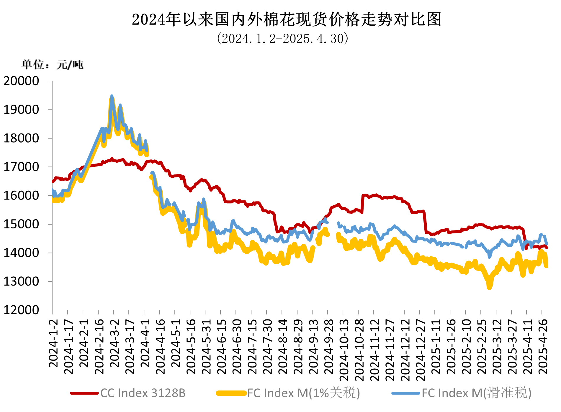 4月,美國政府宣布對所有貿(mào)易伙伴征收對等關稅,其中對中國加征最多并持續(xù)加碼,給我國棉紡織品出口造成負面影響,中國棉花價格指數(shù)上旬急速下行,創(chuàng)4年以來新低;之后隨著我國出臺反制措施、有關部門推出一系列擴大內(nèi)需和促外貿(mào)轉內(nèi)銷政策,為市場注入穩(wěn)定因素,加上紡織行業(yè)仍處傳統(tǒng)旺季,生產(chǎn)保持在高位,國內(nèi)棉價維持小幅波動。國際棉價受關稅政策影響大幅震蕩,內(nèi)外價差有所收窄。