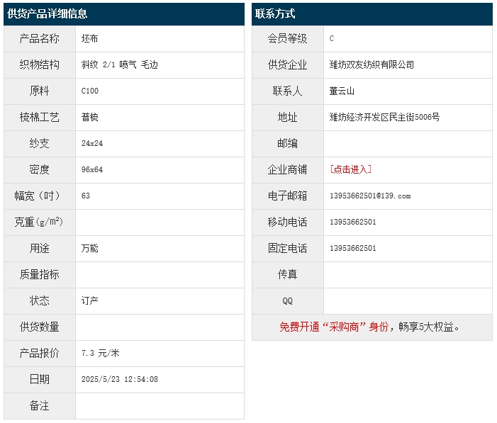 5月23日,濰坊雙友紡織有限公司純棉斜紋布C100 24x24 96x64 63" 2/1 噴氣 毛邊,報價為7.3元/米,實際成交價以協(xié)商為準。[點擊查看詳情]