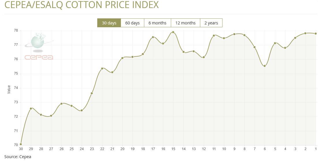 5月22日(周四),巴西CEPEA/ESALQ棉花價(jià)格指數(shù)報(bào)77.80美分/磅,較前一交易日下滑0.03%,較上月同期上漲0.89%。