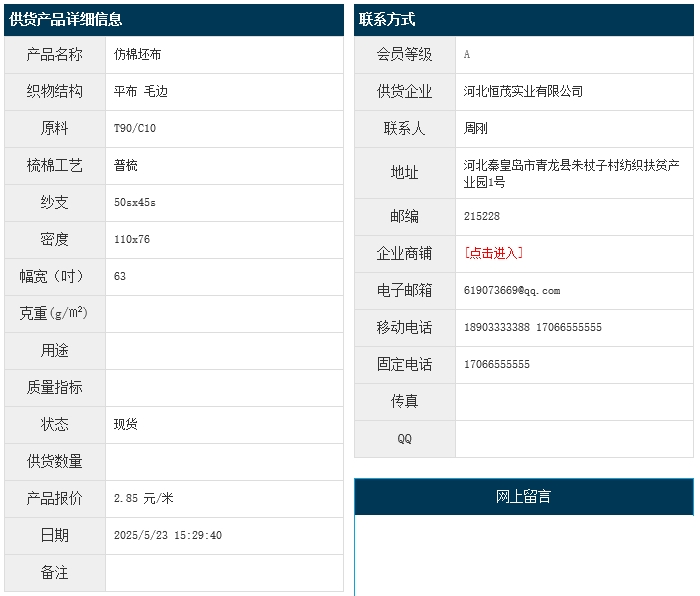 5月23日,河北恒茂實業(yè)有限公司仿棉平布T90/C10 50x45 110x76 63" 毛邊,報價為2.85元/米,實際成交價以協(xié)商為準。[點擊查看詳情]
