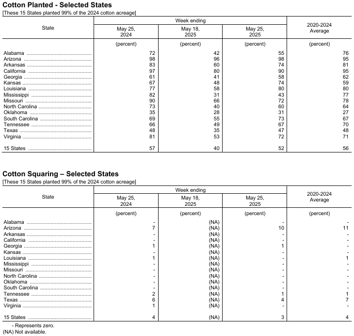 據(jù)美國農(nóng)業(yè)部網(wǎng)站消息,美國農(nóng)業(yè)部(USDA)在每周作物生長報告中公布稱,截至2025年5月25日當(dāng)周,美棉種植率為52%,前周為40%,去年同期為57%,五年均值為56%。美棉現(xiàn)蕾率為3%,上年同期為4%,五年均值為4%。