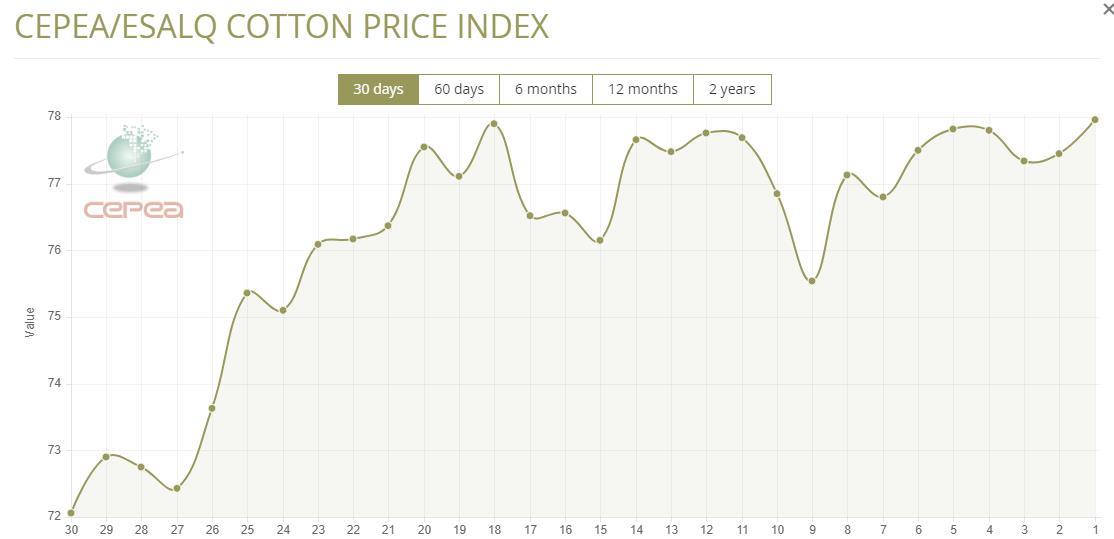 5月27日(周二),巴西CEPEA/ESALQ棉花價格指數(shù)報77.96美分/磅,較前一交易日上漲0.66%,較上月同期上漲1.10%。