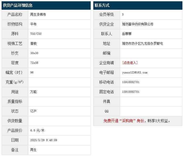 5月29日,濰坊富華紡織有限公司再生滌棉平布T50/C50 30x30 72x56 96",報價為6.8元/米,實際成交價以協(xié)商為準(zhǔn)。[點擊查看詳情]