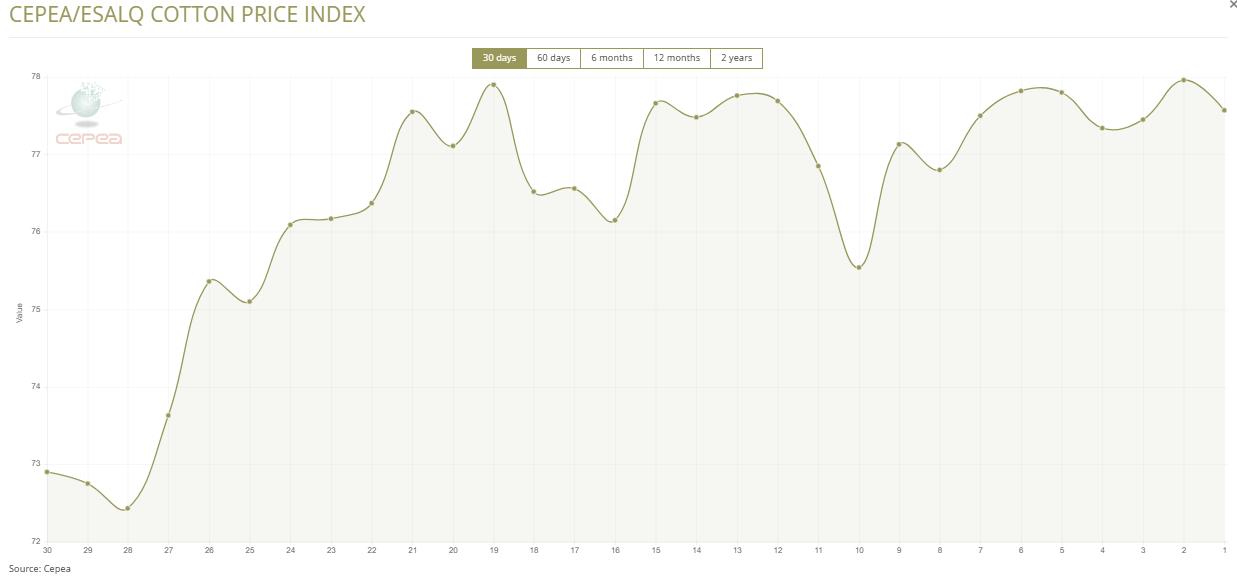 5月28日(周三),巴西CEPEA/ESALQ棉花價(jià)格指數(shù)報(bào)77.57美分/磅,較前一交易日下滑0.5%,較上月同期上漲0.60%。