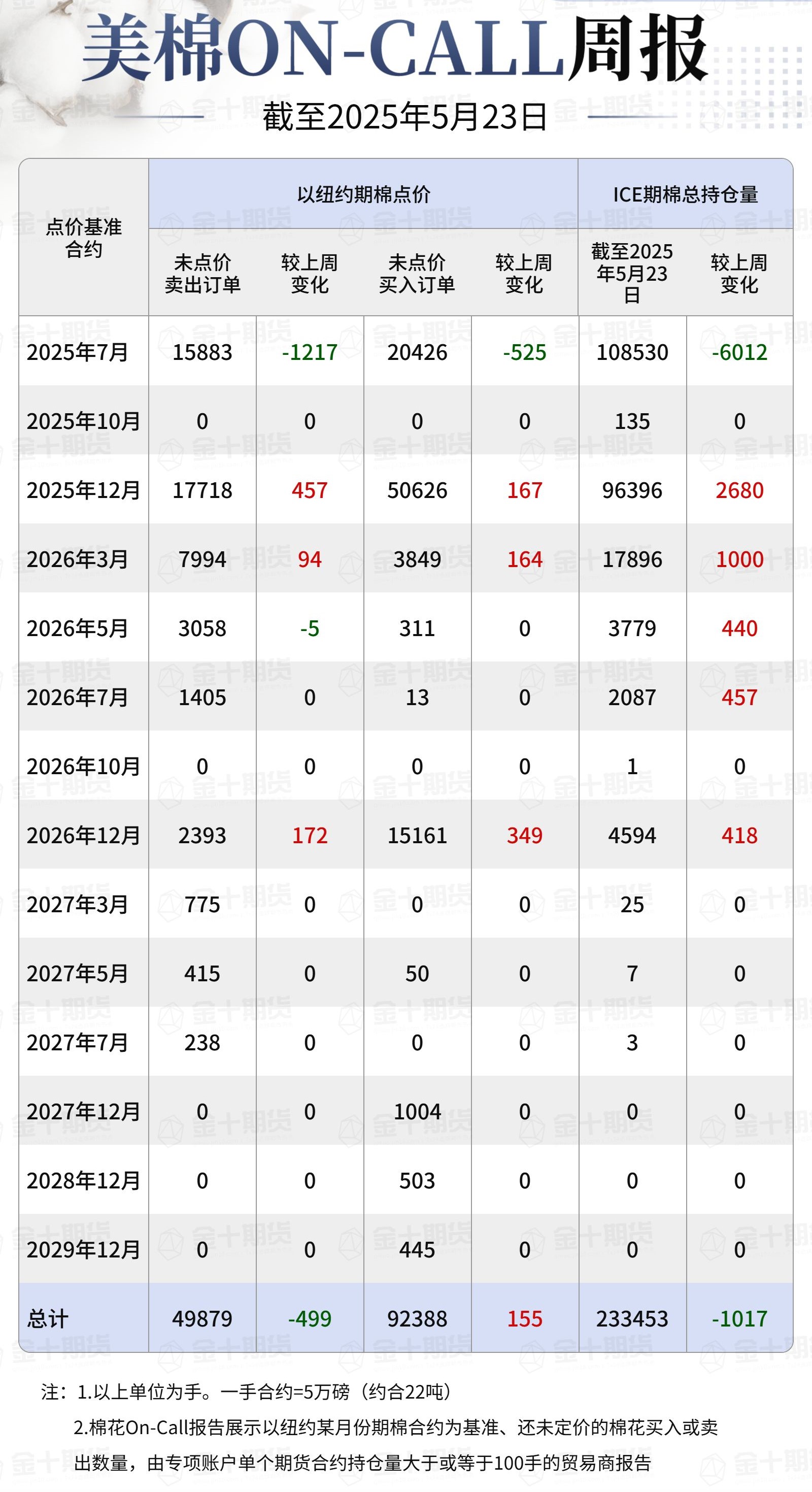 據(jù)美國商品期貨交易委員會(CFTC)最新數(shù)據(jù),截至5月23日,①美棉On-Call未點價賣出訂單49879手,環(huán)比減少499手;未點價買入訂單92388手,環(huán)比增加155手;②ICE期棉2507合約上賣方未點價合約為15883手,環(huán)比減少1217手;③ICE棉花期貨盤面2024/25年度(8月至次年7月)的On-Call合約未點價賣出訂單為15883手,環(huán)比減少1217手。
