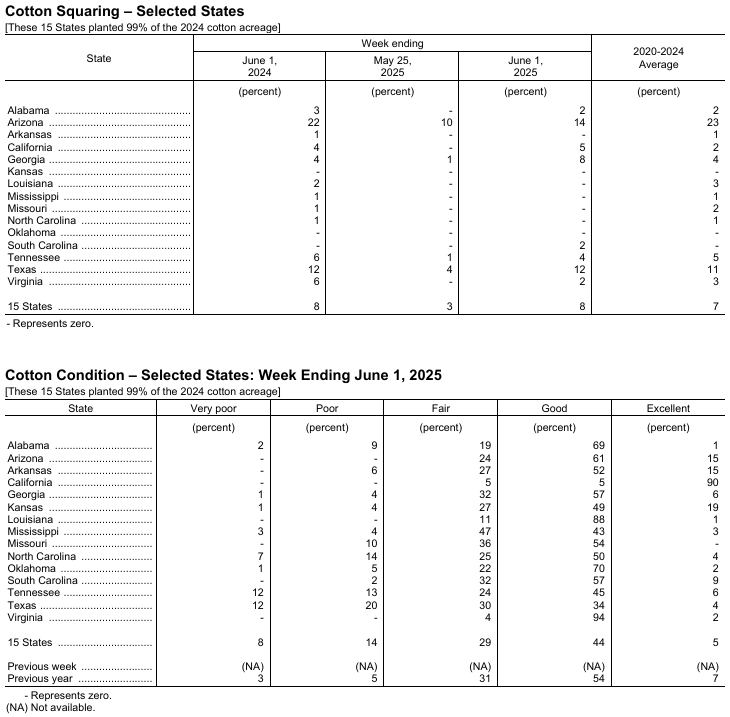 據(jù)美國農業(yè)部網站消息,美國農業(yè)部(USDA)在每周作物生長報告中公布稱,截至2025年6月1日當周,美棉種植率為66%,前周為52%,去年同期為68%,五年均值為69%。美棉現(xiàn)蕾率為8%,前周為3%,上年同期為8%,五年均值為7%。美棉優(yōu)良率為49%,上年同期為61%。