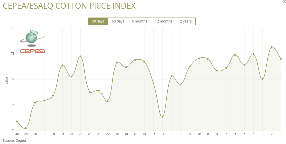 6月3日(周二),巴西CEPEA/ESALQ棉花價格指數(shù)報77.80美分/磅,較前一交易日下跌0.60%,較上月同期上漲1.03%。