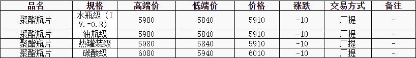 華東聚酯瓶片價(jià)格下跌10元至5910元/噸,原油下滑,原料延續(xù)跌勢(shì),聚酯瓶片工廠部分下調(diào)30-100元/噸,部分維穩(wěn),重心偏弱調(diào)整。6月貨源報(bào)盤5840-5950元/噸或期貨合約2507貼水40元/噸至升水50元/噸,遞盤5800-5900元/噸。