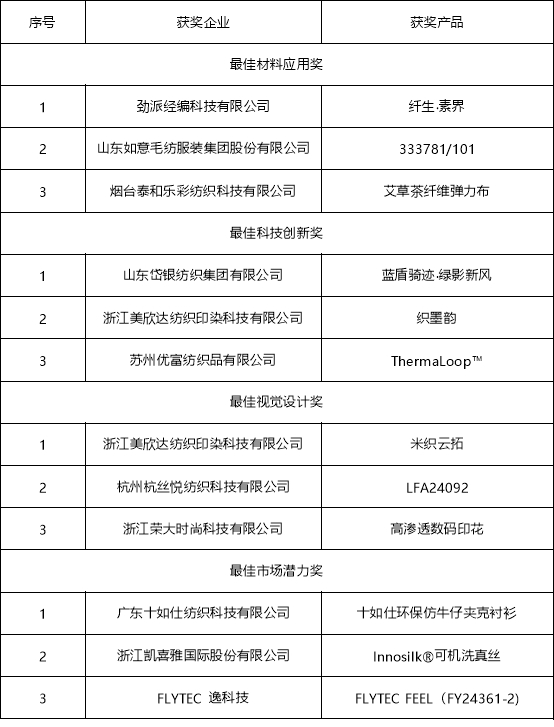 經(jīng)過專家評(píng)審團(tuán)的嚴(yán)格評(píng)審與多輪遴選,2025“永續(xù)新生綠色時(shí)尚”紡織服裝產(chǎn)業(yè)可持續(xù)產(chǎn)品評(píng)選大賽最終評(píng)選出以下獎(jiǎng)項(xiàng)得主:評(píng)委會(huì)大獎(jiǎng)8個(gè)、最佳材料應(yīng)用獎(jiǎng)3個(gè)、最佳科技創(chuàng)新獎(jiǎng)3個(gè)、最佳視覺設(shè)計(jì)獎(jiǎng)3個(gè)、最佳市場(chǎng)潛力獎(jiǎng)3個(gè)、優(yōu)秀入圍獎(jiǎng)14個(gè)。