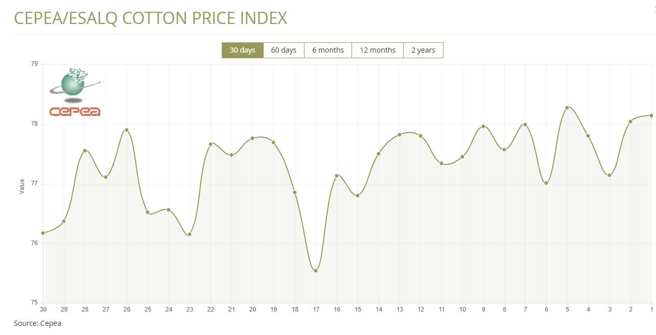 6月6日(周五),巴西CEPEA/ESALQ棉花價格指數(shù)報78.14美分/磅,較前一交易日上漲0.13%,較上月同期上漲1.47%。