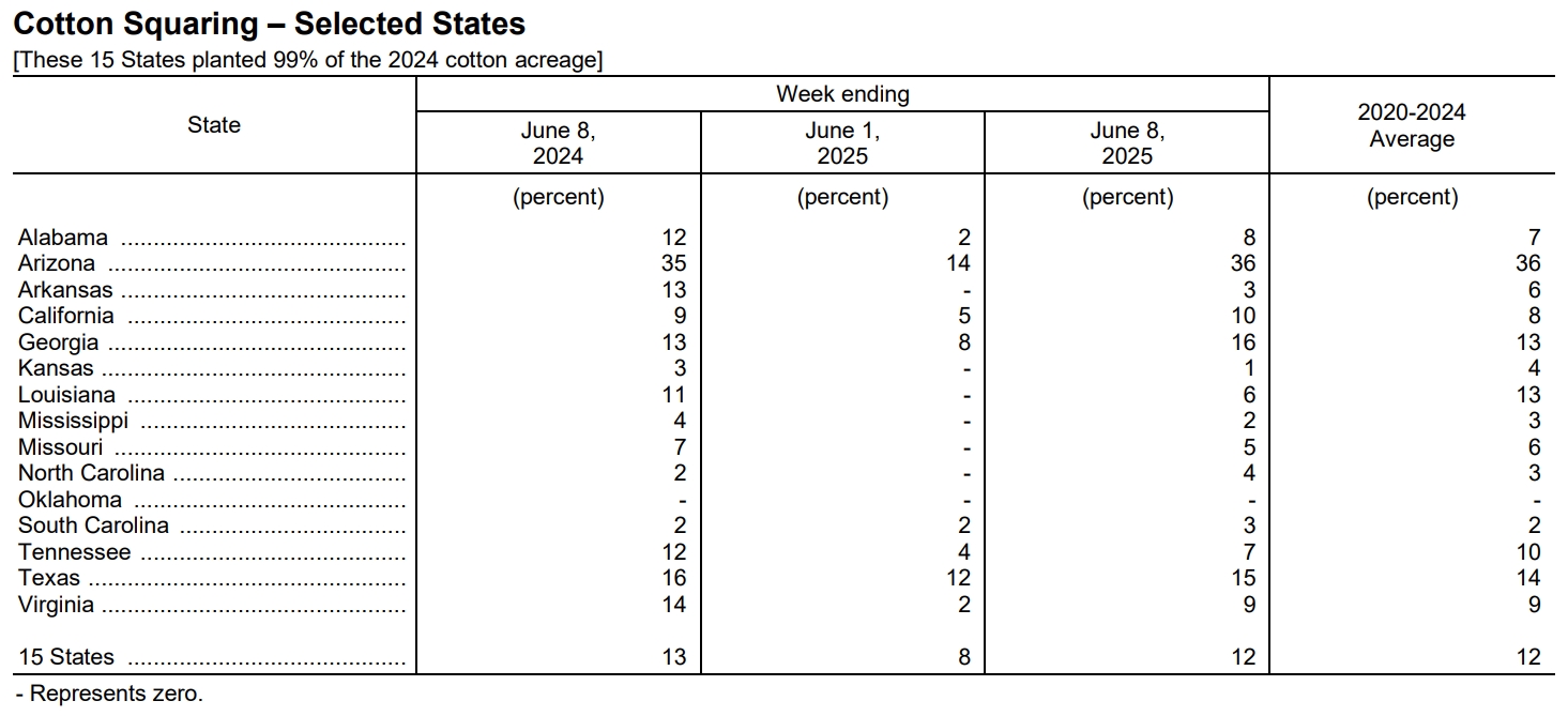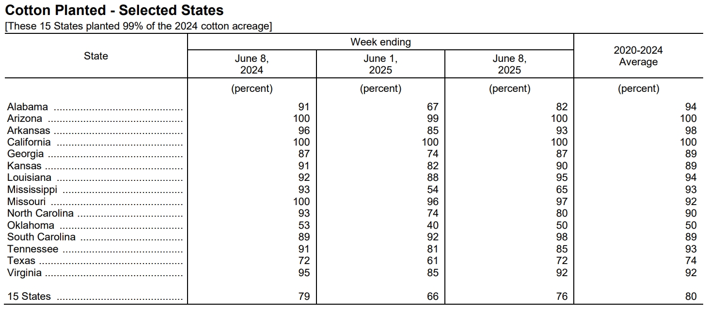 據美國農業(yè)部網站消息,美國農業(yè)部(USDA)在每周作物生長報告中公布稱,截至25年6月8日當周,美棉種植率為76%,前周為66%,去年同期為79%,五年均值為80%。美棉現(xiàn)蕾率為12%,前周為8%,上年同期為13%,五年均值為12%。美棉優(yōu)良率為49%,持平于前周,上年同期為56%。