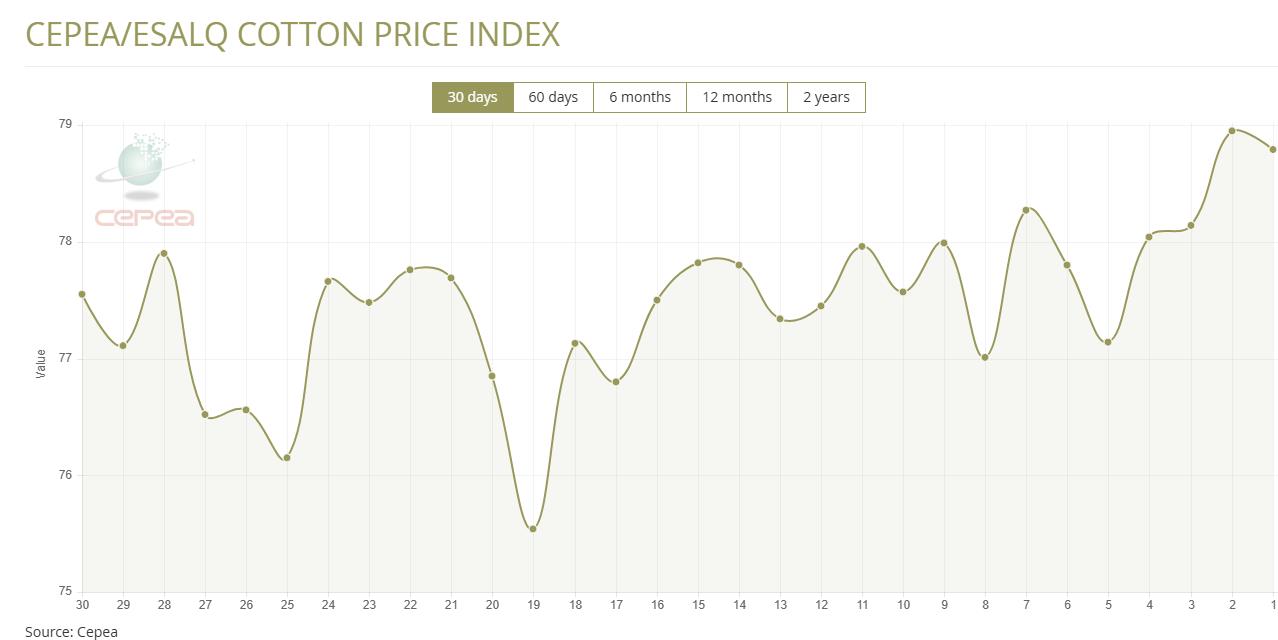 6月10日(周二),巴西CEPEA/ESALQ棉花價格指數(shù)報78.79美分/磅,較前一交易日下跌0.2%,較上月同期上漲2.31%。