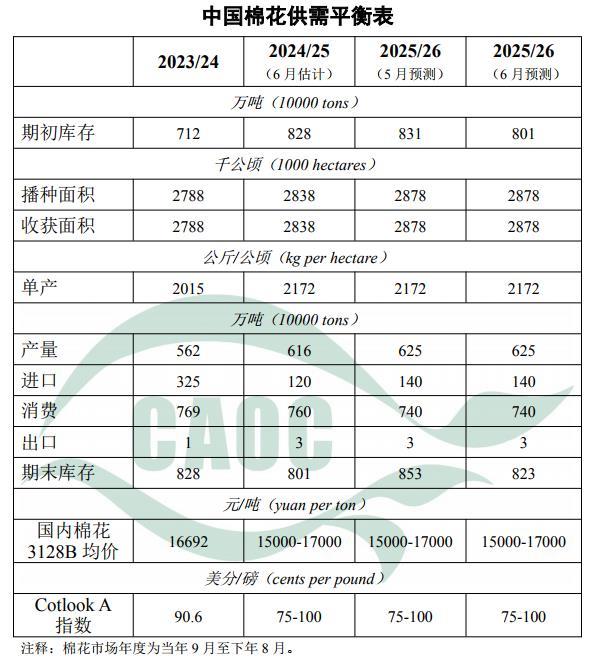 受美國濫施關(guān)稅影響,棉花進口低于預(yù)期,本月將2024/25年度進口量調(diào)至120萬噸,較上月下調(diào)30萬噸,期末庫存下調(diào)至801萬噸。本月預(yù)測,2025/26年度中國棉花供需形勢與上月保持一致。播種以來,全國棉區(qū)光溫總體適宜,利于棉花生長,目前新疆大部地區(qū)棉花進入現(xiàn)蕾期,黃河流域、長江流域棉花處第5真葉至現(xiàn)蕾期,大部分棉花發(fā)育期提前3-15天,后期需持續(xù)關(guān)注天氣對單產(chǎn)的影響。