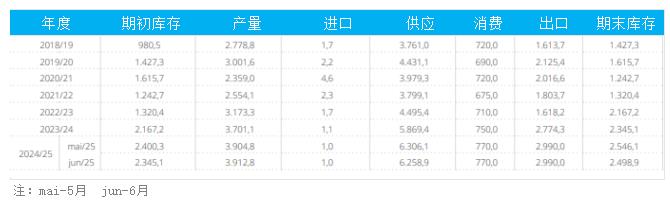 以下為巴西棉花供需平衡表(單位:千噸)