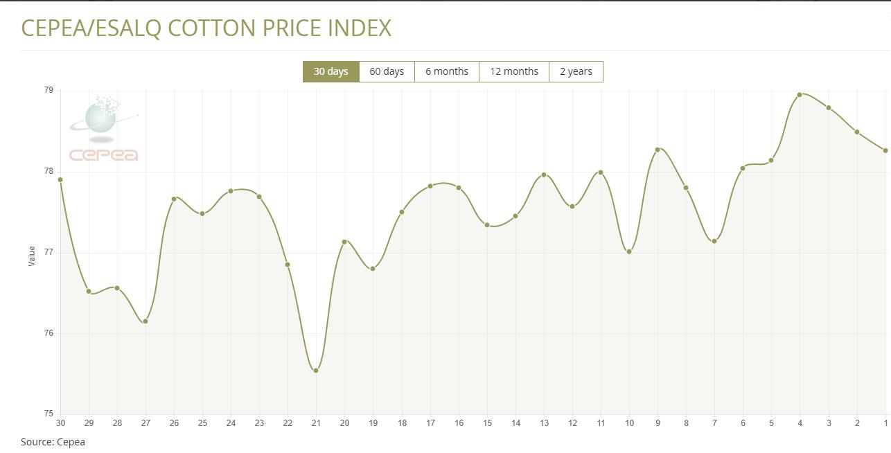 6月12日(周四),巴西CEPEA/ESALQ棉花價(jià)格指數(shù)報(bào)78.26美分/磅,較前一交易日下跌0.29%,較上月同期上漲1.62%。