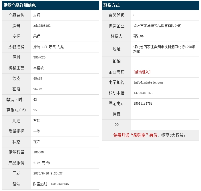 6月16日,晉州榮馬紡織品銷售有限公司滌棉府綢T80/BJC20 45x45 96x72 63" 1/1 95g/㎡ 噴氣 毛邊,報價為2.95元/米,實際成交價以協商為準。[點擊查看詳情]