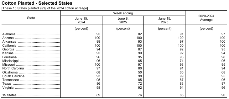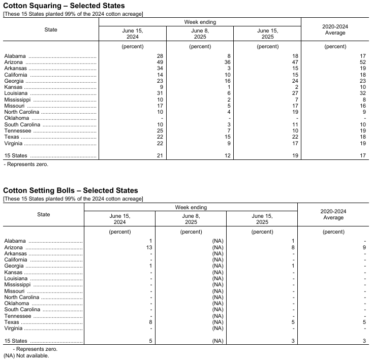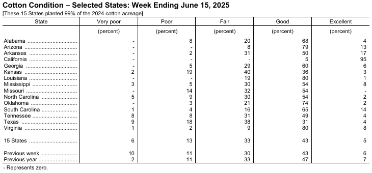 據(jù)美國(guó)農(nóng)業(yè)部網(wǎng)站消息,美國(guó)農(nóng)業(yè)部(USDA)在每周作物生長(zhǎng)報(bào)告中公布稱,截至2025年6月15日當(dāng)周,美棉種植率為85%,前周為76%,去年同期為89%,五年均值為90%。美棉現(xiàn)蕾率為19%,前周為12%,上年同期為21%,五年均值為17%。美棉結(jié)鈴率為3%,前周為0%,上年同期為5%,五年均值為3%。美棉優(yōu)良率為48%,前周為49%,上年同期為54%。