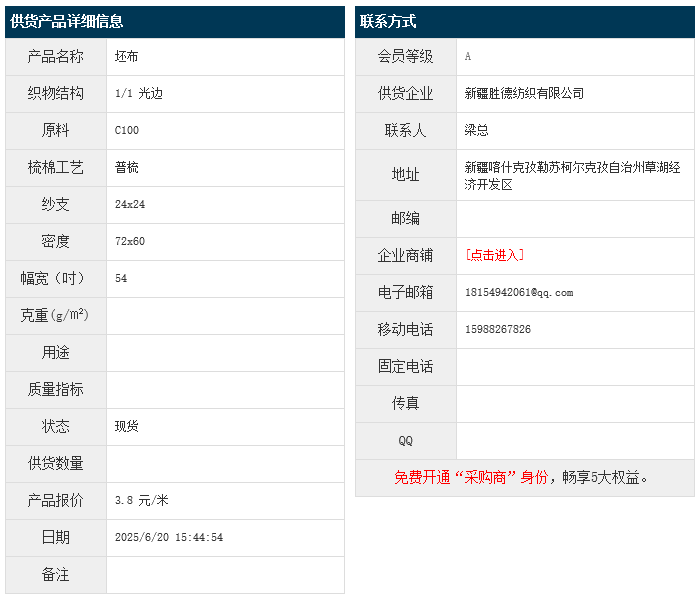 6月20日,新疆勝德紡織有限公司純棉布C100 24x24 72x60 54" 1/1 光邊,報(bào)價(jià)為3.8元/米,實(shí)際成交價(jià)以協(xié)商為準(zhǔn)。[點(diǎn)擊查看詳情]