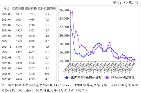 (一)國內(nèi)棉價環(huán)比略漲。隨著中美關(guān)稅戰(zhàn)階段性緩和,部分前期擱置的對美訂單有所恢復(fù),但當前市場進入傳統(tǒng)淡季,紡企采購棉花積極性減弱,棉價上漲有限。5月,國內(nèi)3128B級棉花月均價每噸14430元,環(huán)比漲0.2%,同比跌12.2%。鄭棉期貨主力合約(CF509)月結(jié)算價每噸13330元,環(huán)比漲2.5%,同比跌14.1%。