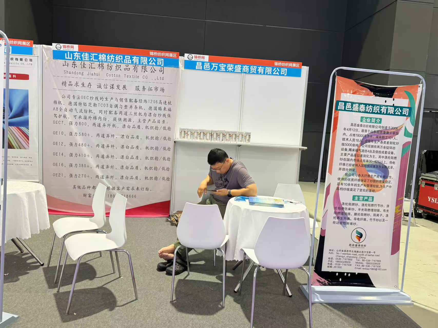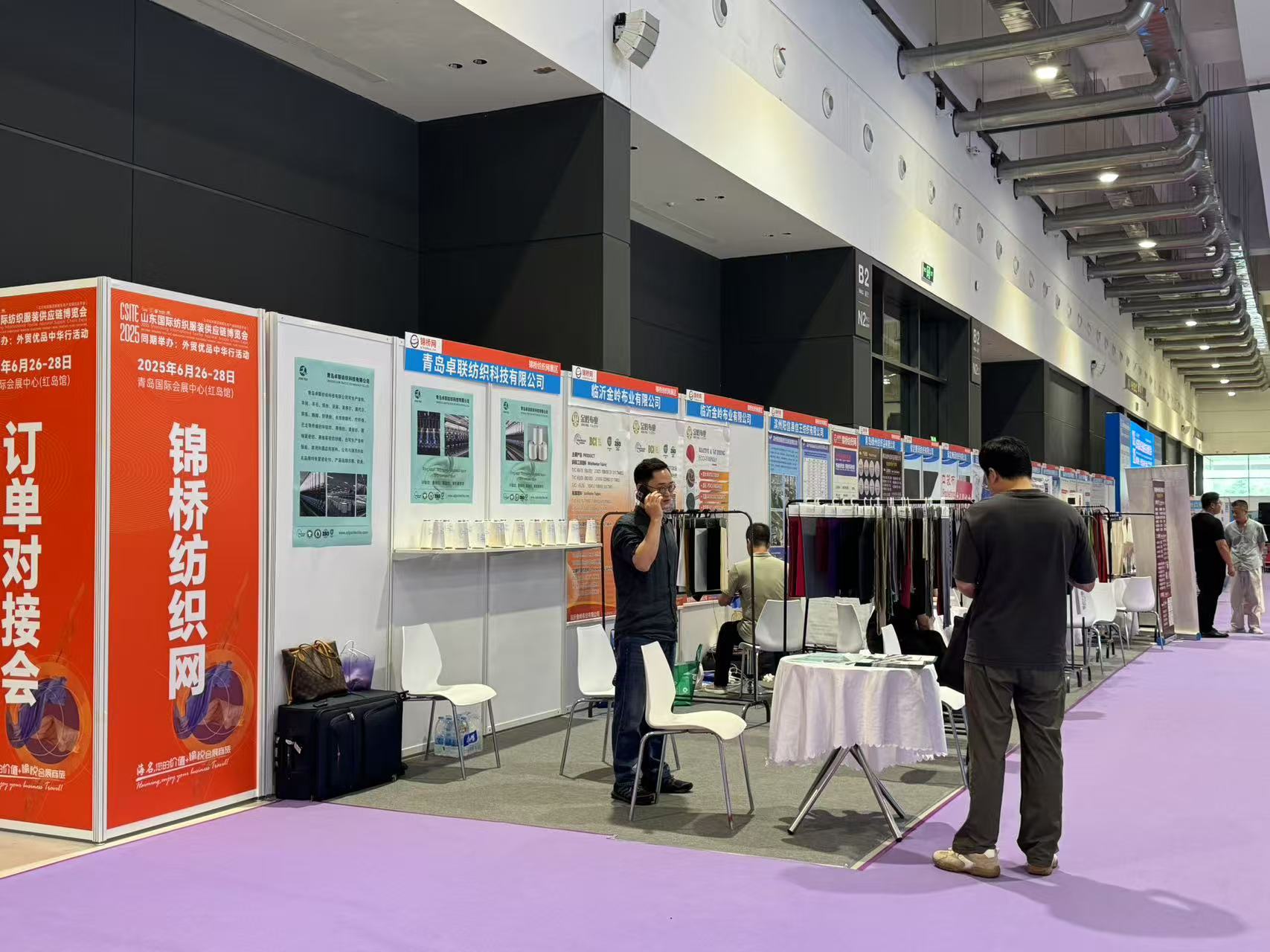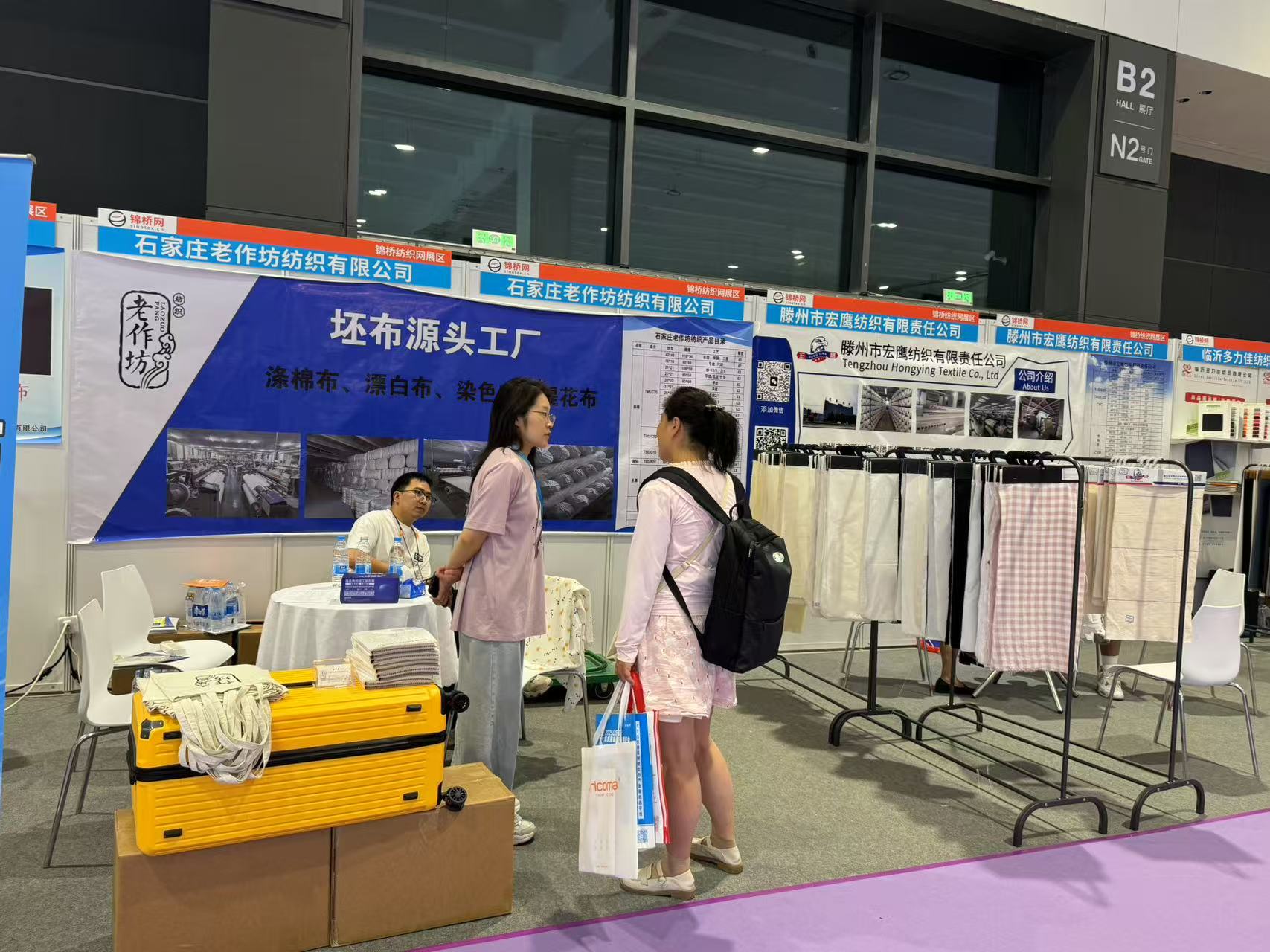 此次展會為會員客戶設立錦橋紡織網紗線坯布展區(qū),參展會員有青島卓聯(lián)紡織科技、臨沂金嶺布業(yè)、石家莊老作坊紡織、濱州信王紡織、青島綠州紡織品、保定騰潤紡織、滕州宏鷹紡織、臨沂多力佳紡織、昌邑萬寶榮盛商貿、山東佳匯棉紡織品(排名不分先后)。